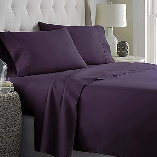 Marina Decoration 600スレッドカウント ウルトラソフト ディープポケット ホテルスタンダード 無地 ロングステープルコットン シーツ4点セット 枕カバー2枚付き ナスカラー クイーンサイズ