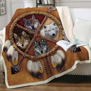 Sleepwish ウルフドリームキャッチャーブランケット 4匹の狼ドリームキャッチャー フリースブランケット シェルパ ブランケット キング (108インチx90インチ)