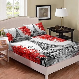 Erosebridal エッフェル塔 ボックスシーツ レッド メープルリーフ 寝具セット クイーンサイズ キッズ ティーン 大人 パリシティ ビルディングベッドカバー フランスの橋 手塗り ロマンティックベッドセット グレーとホワイト
