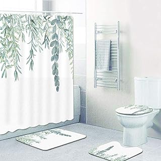 Riyidecor シャワーカーテン 緑の葉 60 x 72インチ バスルームラグ3点セット メタルフック 水彩 ボタニカル バス 輪郭マット トイレ蓋カバー U字型 滑り止め 洗面所 装飾 シャワーアクセサリー